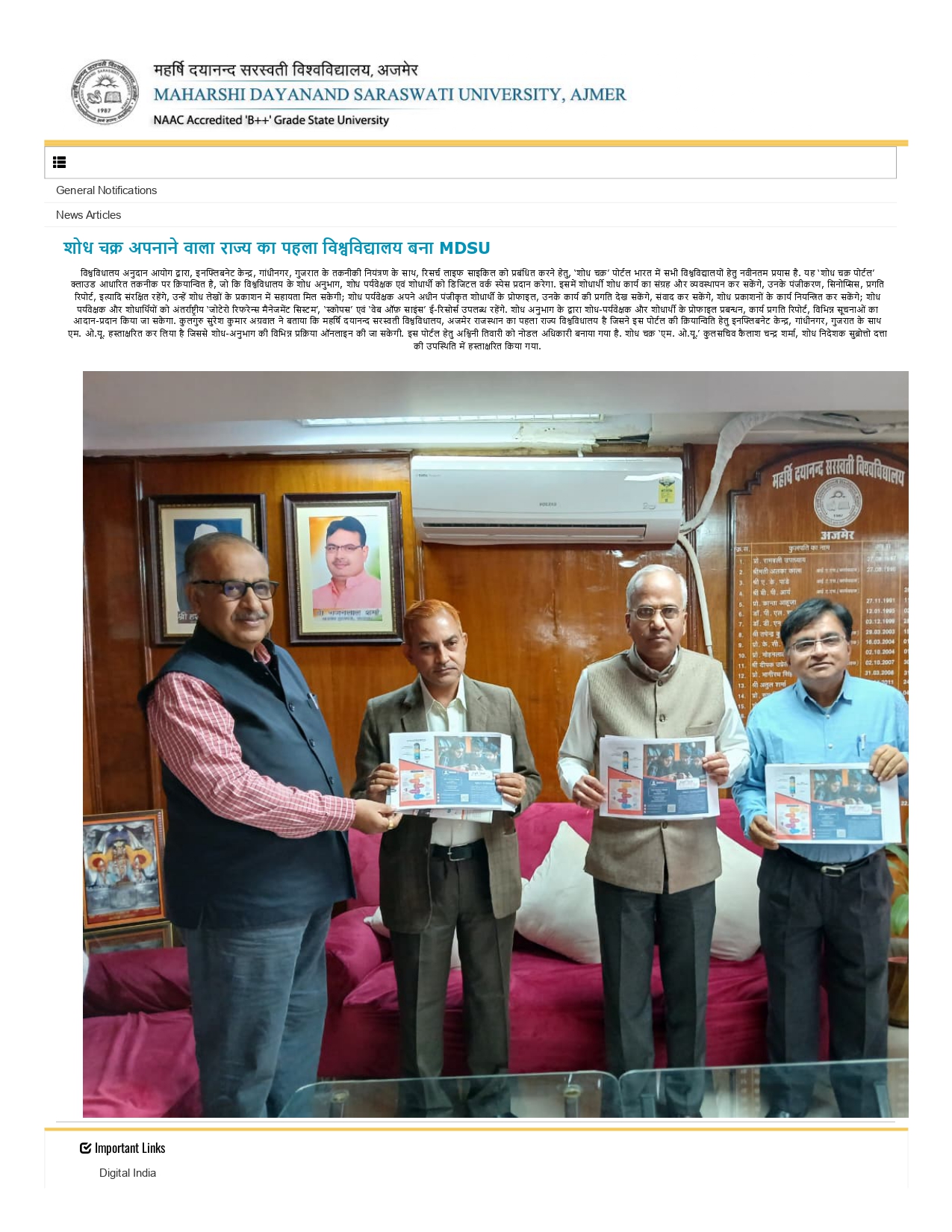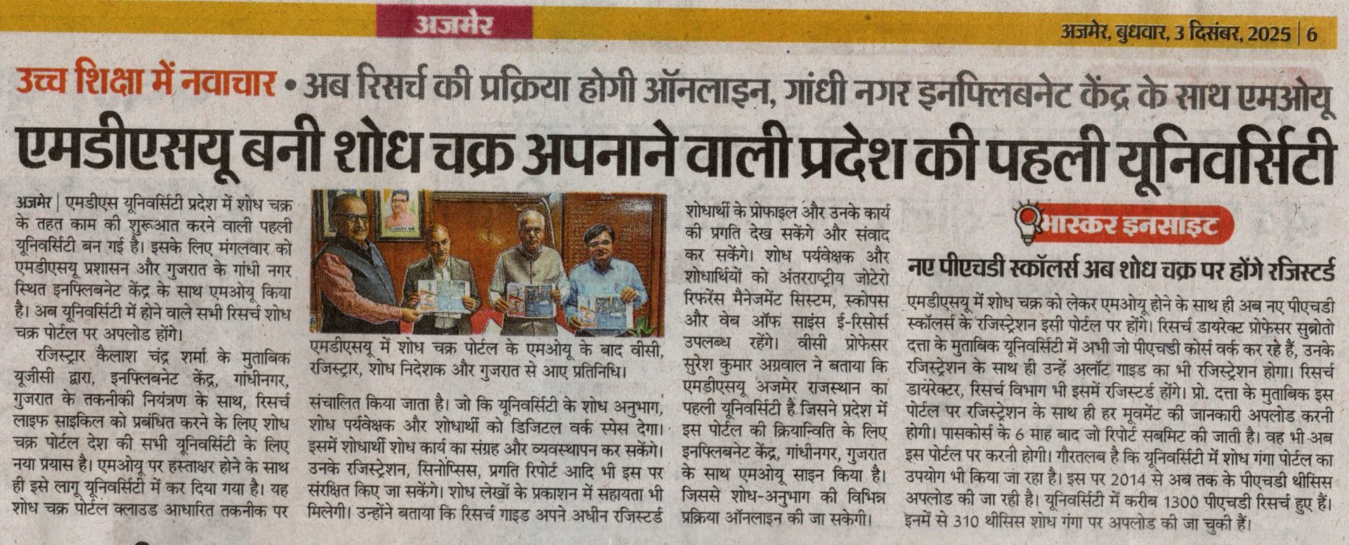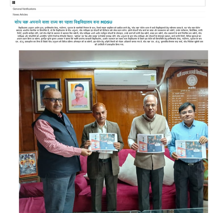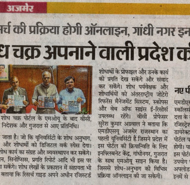 The M.D.S.U. is the VERY FIRST Government Sector University in the state of Rajasthan implemented the Shodh Chakra; signed MoU on 2nd December 2025 with the INFLIBNET Centre.